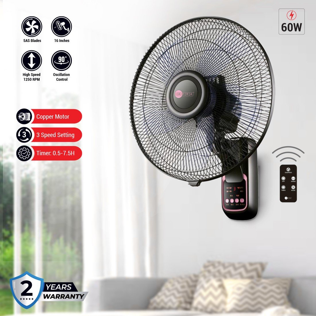 AFRA 16-Inch Wall Mount Fan, 60W, 1250 RPM, 3-Speed Remote, 90° Oscillation – AF-1612WFBG, 2Y Warranty