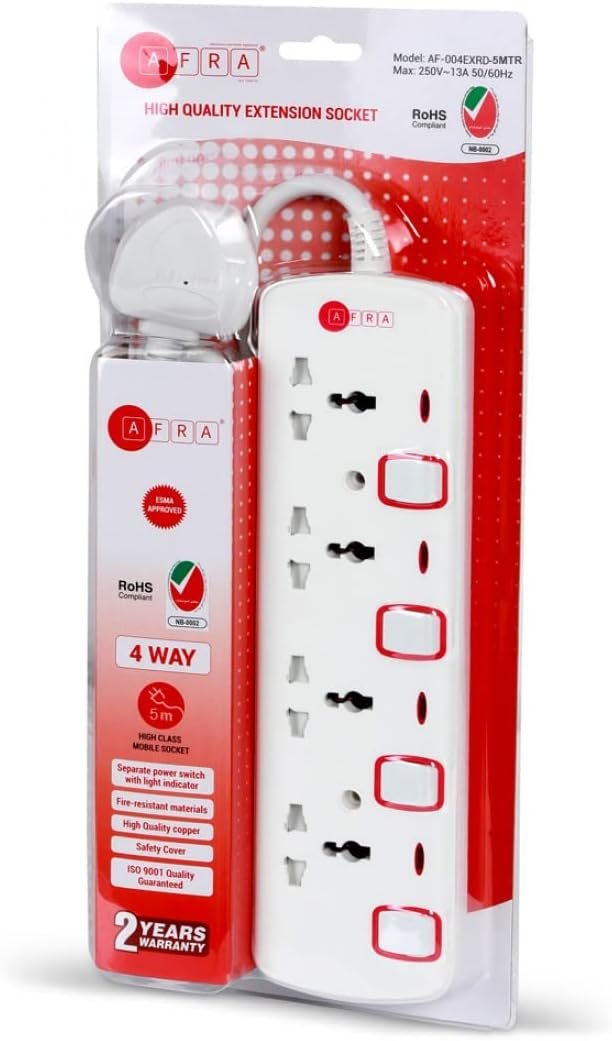 The AFRA Extension Cord – Model AF-004EXRD-5MT is a durable and efficient solution for powering multiple devices safely. With 4 universal sockets and a 5-meter cable, it offers extended reach and compatibility with a wide range of plugs.