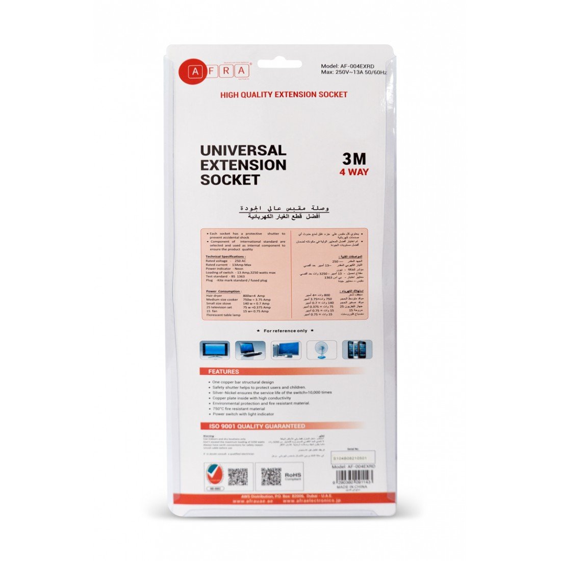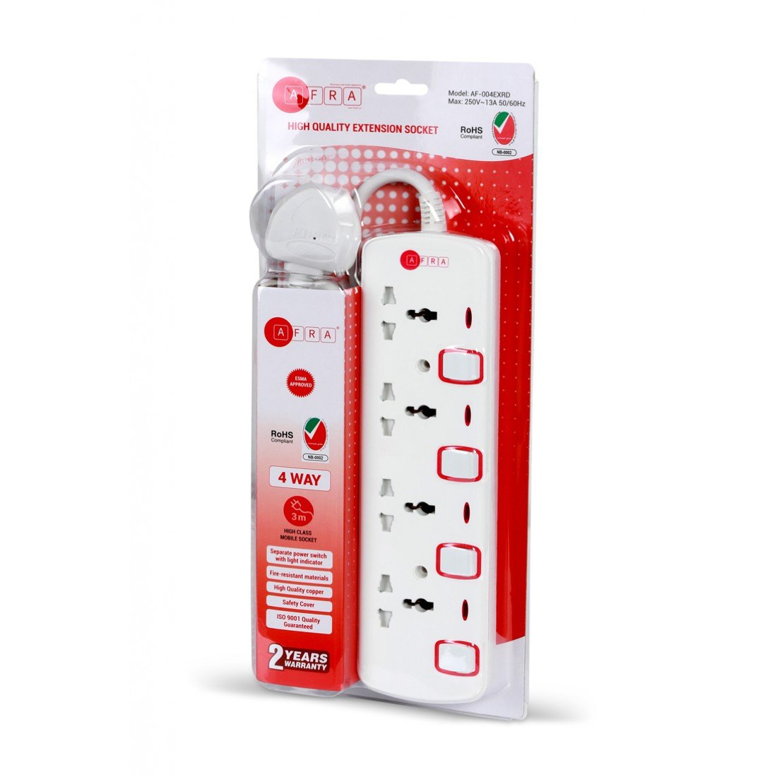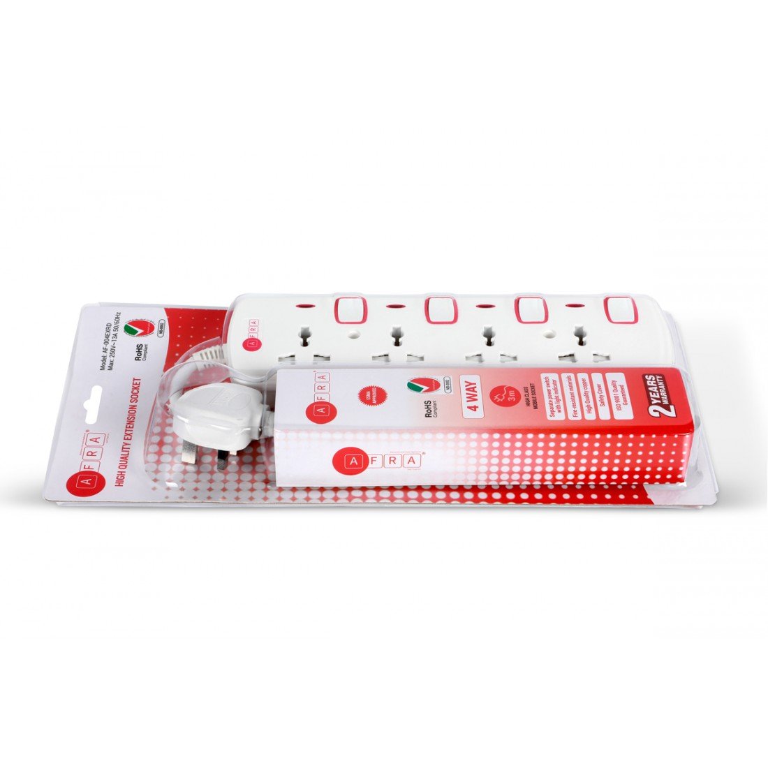 The AFRA Japan Universal Extension Cord (Model AF-004EXRD) is a safe and efficient power extension solution, ideal for home, office, or commercial use. With 4 universal sockets and a 3-meter heavy-duty cable, it offers ample reach and versatility for powering multiple devices. Designed according to Japanese standards, it supports up to 250V and features shock-proof construction for maximum user safety. Built for durability and daily use, this extension cord is perfect for electronics, kitchen appliances, computers, and more. Trust in AFRA’s quality with this reliable and secure power extension solution.