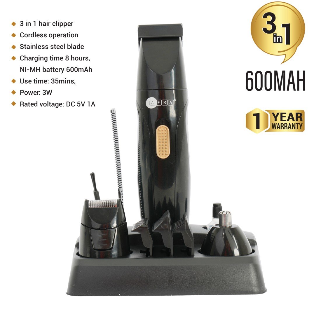 The AFRA Personal 3 In 1 Hair Clipper Grooming Kit (Model AF-0003HTBK) is designed for versatile grooming needs. Featuring a clear LED display to monitor battery life and settings, this kit is powered by a reliable 600mAh Ni-MH rechargeable battery that provides up to 35 minutes of cordless operation. With an IPXO rating for water resistance, it’s suitable for easy cleaning and daily use. Compact and ergonomic, the grooming kit offers precise trimming and styling options in a portable design. Backed by a 1-year warranty, it ensures quality and durability for your personal grooming routine.