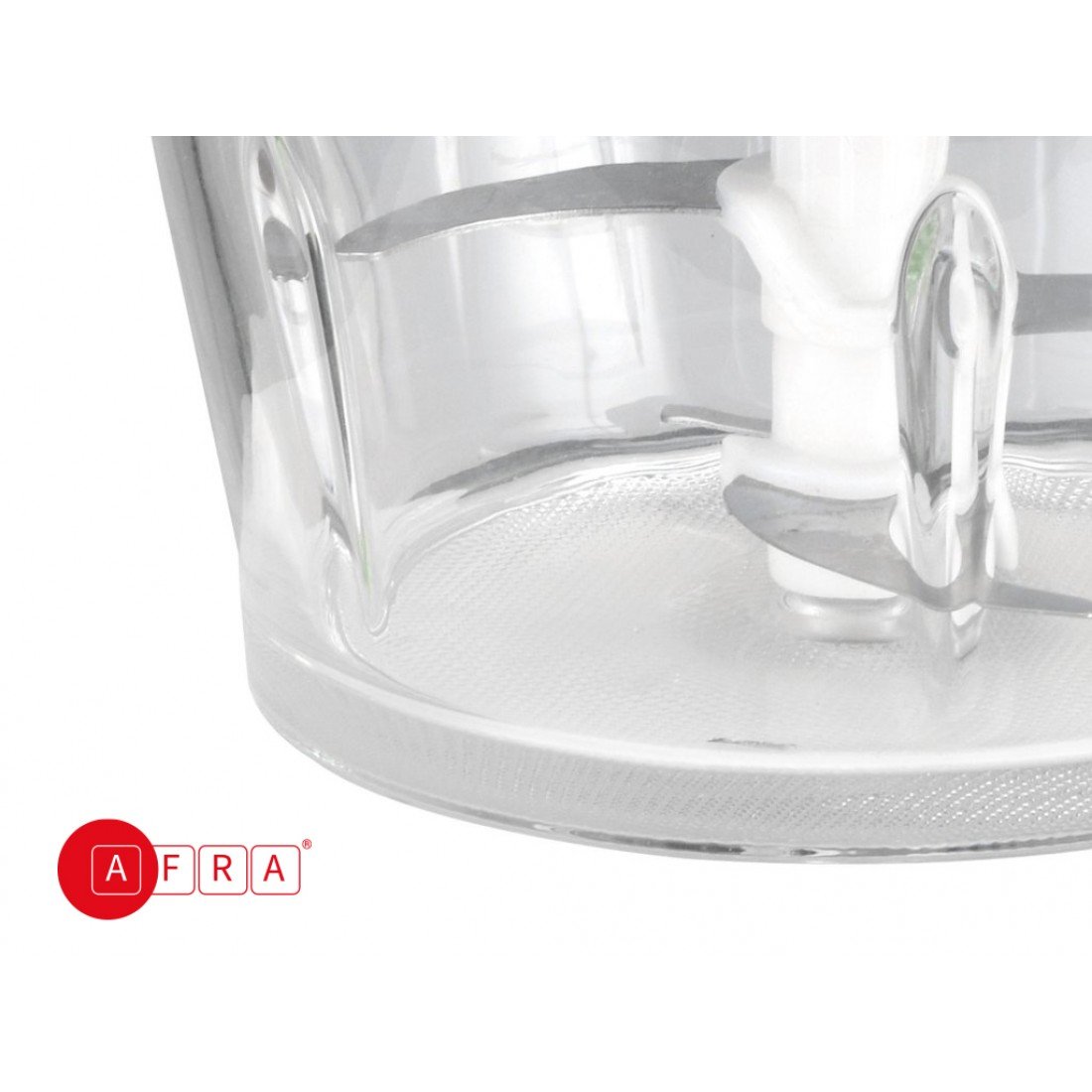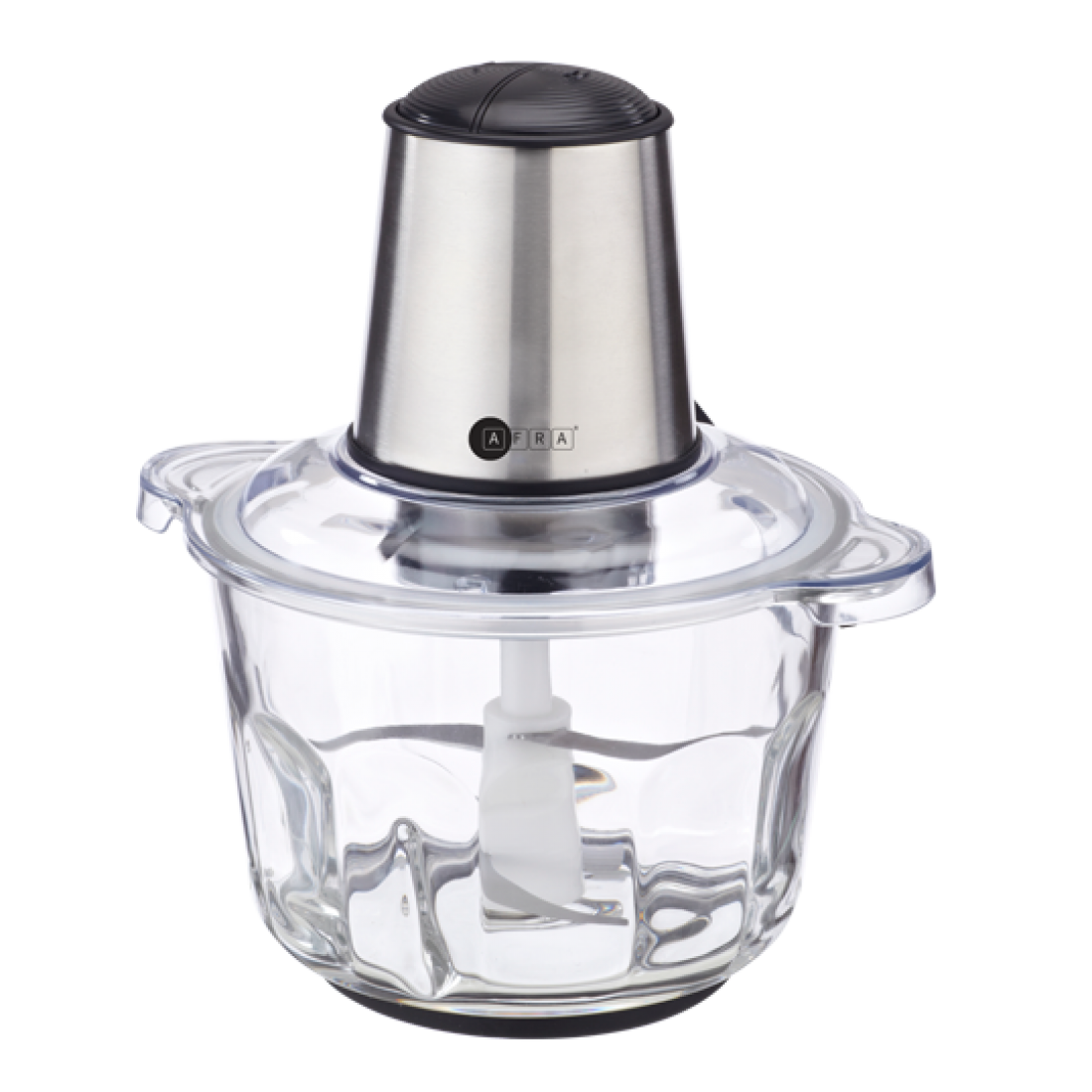 AFRA 400W compact chopper with 2.5L glass jar, stainless steel blades & 2-year warranty.