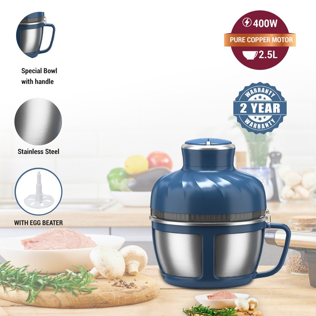 Upgrade your kitchen efficiency with the AFRA Stainless Steel Chopper – Model AF-425CHSS. Engineered with a powerful 400W copper motor (5425 type), this compact yet capable chopper offers 2 adjustable speeds for versatile performance. Whether you’re chopping vegetables, herbs, or meats, the durable stainless steel blades and bowl with handle make food prep faster, cleaner, and more efficient.The 2.5-litre stainless steel bowl provides ample capacity and long-lasting durability, while the easy-grip handle ensures safe, spill-free operation. Built for performance and convenience, this chopper is perfect for daily kitchen use. Backed by a 2-year warranty, it offers reliable service and peace of mind.