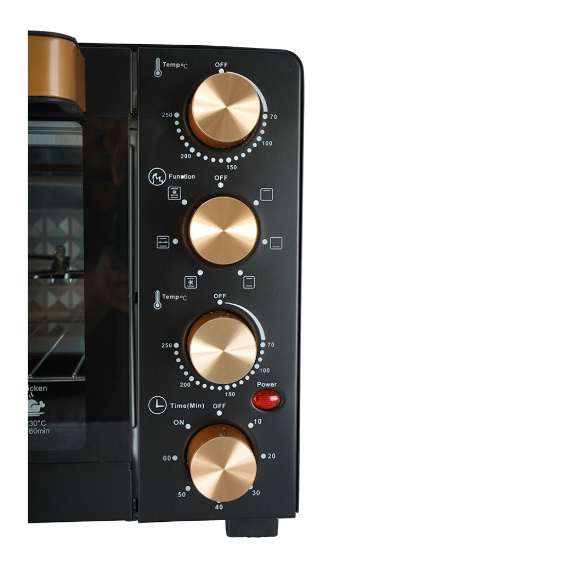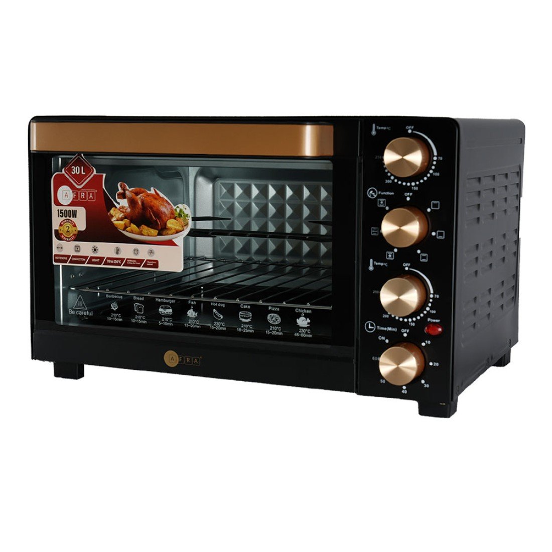 Cook, bake, roast, and grill with ease using the AFRA Electric Oven Toaster – Model AF-3015OTBK. With a generous 30-liter capacity and 1500W of power, this versatile oven is ideal for family meals, party snacks, or everyday cooking.It features 7 cooking functions, including rotisserie and convection settings for even heat distribution and perfectly cooked meals. An adjustable thermostat ranging from 70°C to 250°C ensures precise temperature control for baking and roasting. The built-in oven lamp provides a clear view of your food as it cooks, while the 4 durable knobs offer intuitive control.Accessories included are a baking tray, wire rack, and handle, making your cooking process seamless. The AFRA AF-3015OTBK combines performance, convenience, and stylish black design to elevate your kitchen experience.it’s built to last with safety and quality assurance.