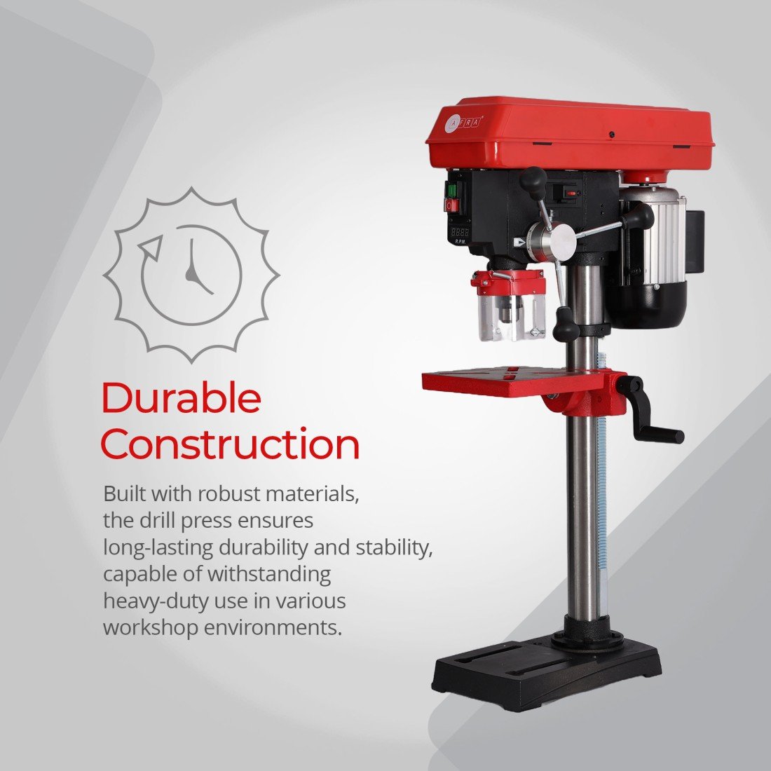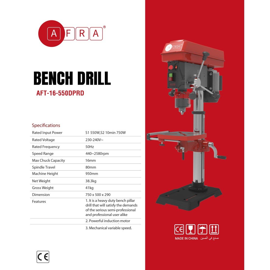 AFRA Drill Press – Model AFT-16-550DPRD is a compact yet powerful bench drill designed for accuracy and versatility in professional and home workshops. It features a 550W powerful induction motor and a 16mm chuck capacity, capable of handling various materials including wood, metal, and plastic.