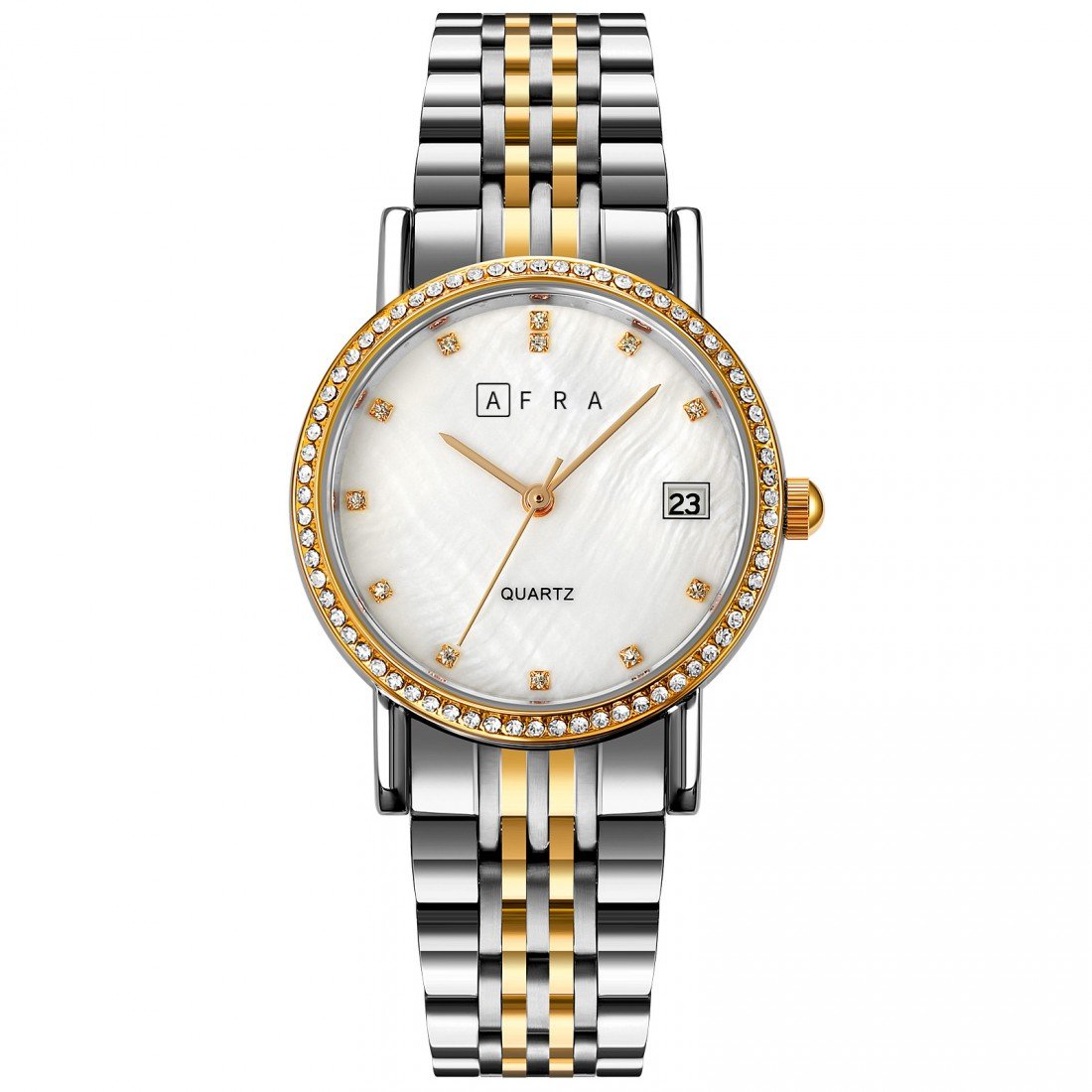 The AFRA Calla Ladies Watch AF20602 exudes timeless elegance with its sophisticated two-tone design. Featuring a polished gold and silver metal case, complemented by a luminous white mother-of-pearl (MOP) dial, this watch radiates luxury and style. The matching two-tone silver and gold bracelet offers both comfort and a versatile aesthetic suitable for any occasion. Powered by precise quartz movement, the Calla AF20602 is ideal for women who seek a stylish yet functional timepiece for everyday wear or special events.