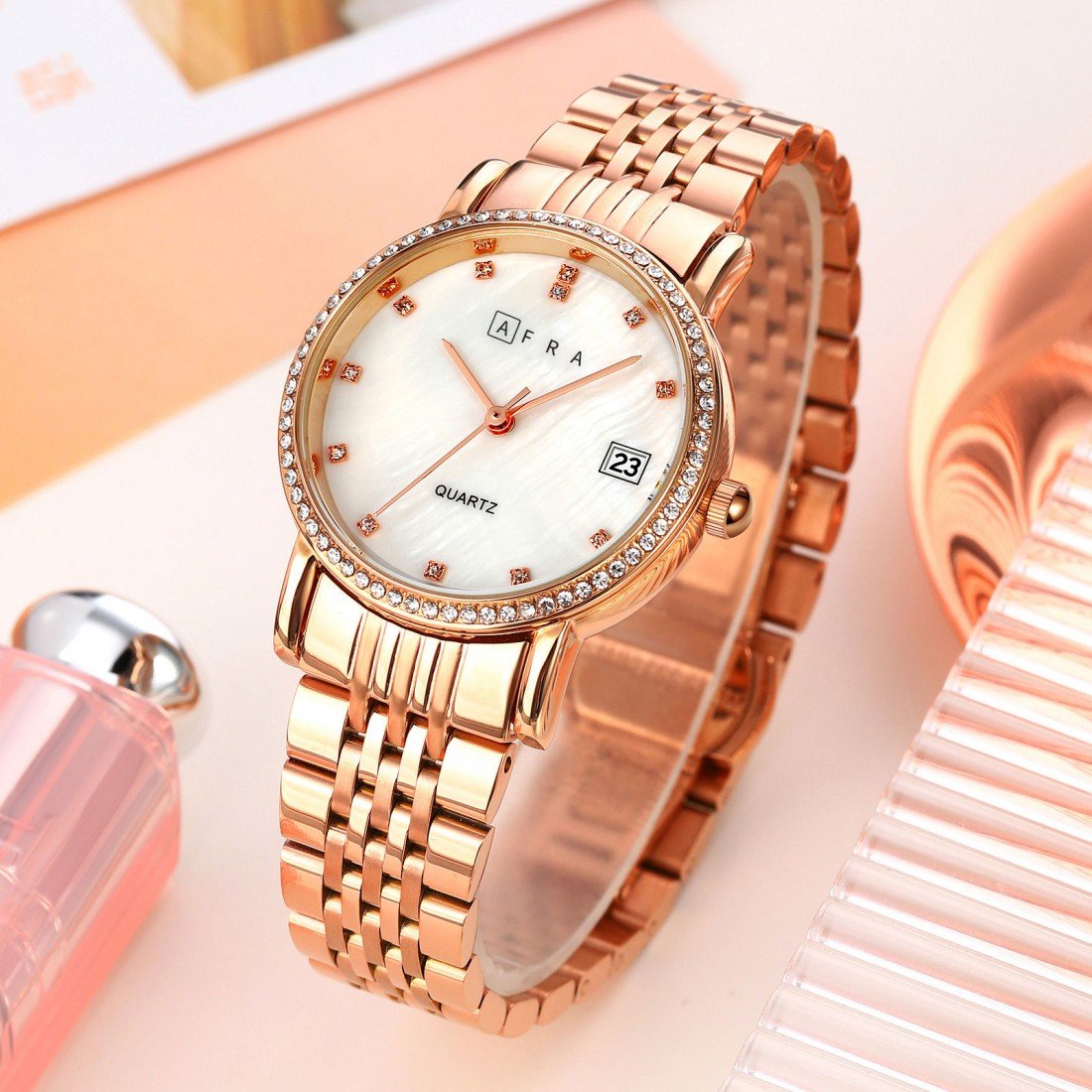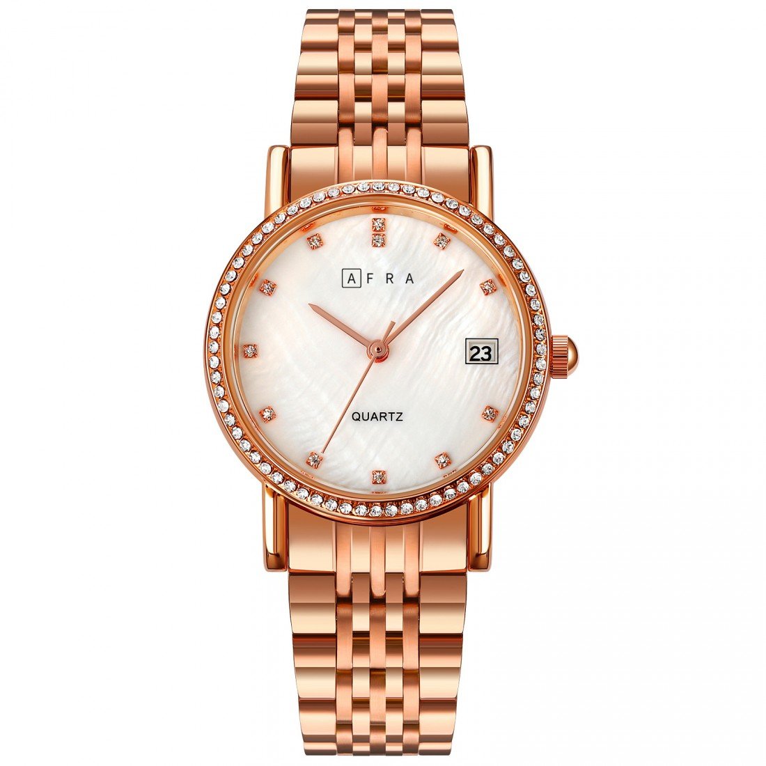 The AFRA Calla Ladies Watch AF20604 showcases a perfect blend of feminine elegance and refined minimalism. With its radiant rose gold-tone case and shimmering white mother-of-pearl (MOP) dial, this timepiece captures attention effortlessly. The matching rose gold bracelet adds a touch of sophistication and comfort, making it a versatile accessory for both formal and everyday wear. Featuring a precise quartz movement, the Calla AF20604 offers reliable timekeeping wrapped in timeless beauty—crafted for women who appreciate style with grace.